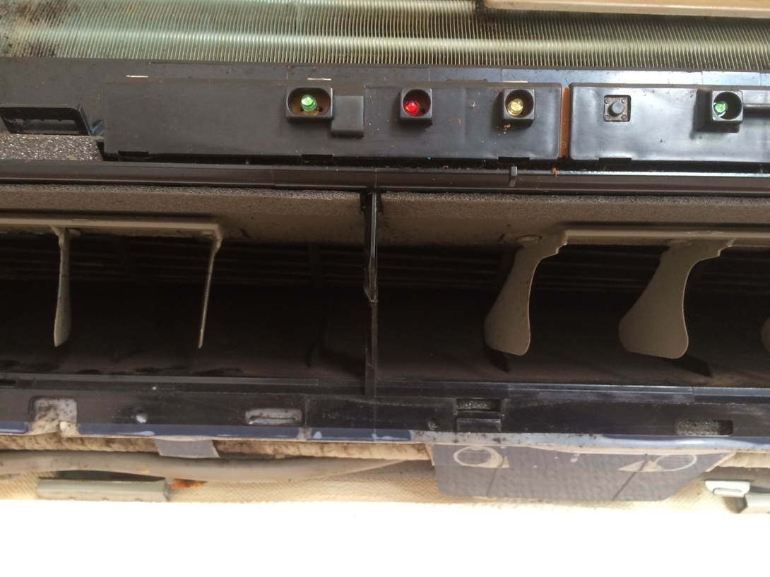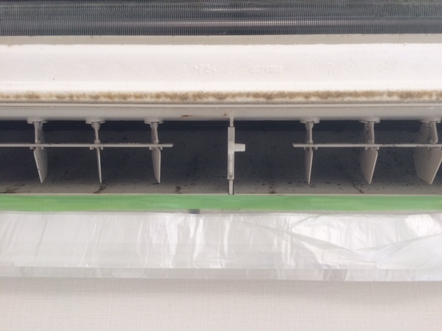 上記のような症状が出る場合、やはりエアコン内部を覗いてみると下記写真のような汚れやカビの繁殖が確認されます。 体感する異常が出始めたらエアコンクリーニングのタイミングと言えます。