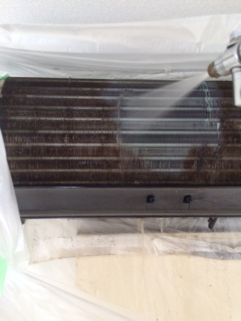 壁掛けエアコン(フィルターおそうじ機能の付いていない機種)については、フィルター・全面パネル・パネル・ルーバーの取り外し・基盤、電装品に水が掛からない様に養生を行い、専用の洗剤・エアコン専用の高圧洗浄機を使用して内部アルミフィン、シロッコファンを高圧洗浄クリーニング致します。